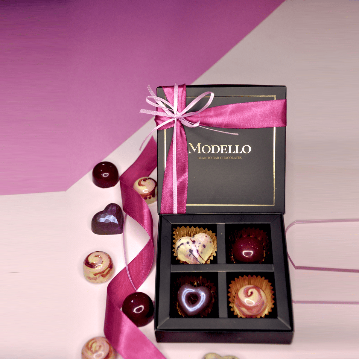 This box contains 4 pieces of assorted chocolate bonbons, filled with handcrafted ganache made inhouse with fresh cream.